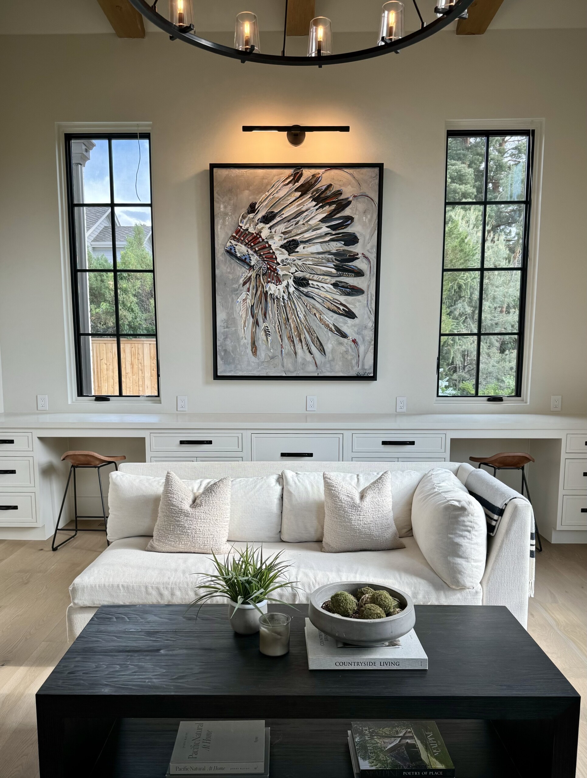 When I was in my late 20s, I wanted art for our home but couldn’t afford gallery work, so decided I would create something for our walls. I have always been inspired by Native American art, culture and clothing, so I decided to paint my first headdress for our family home.