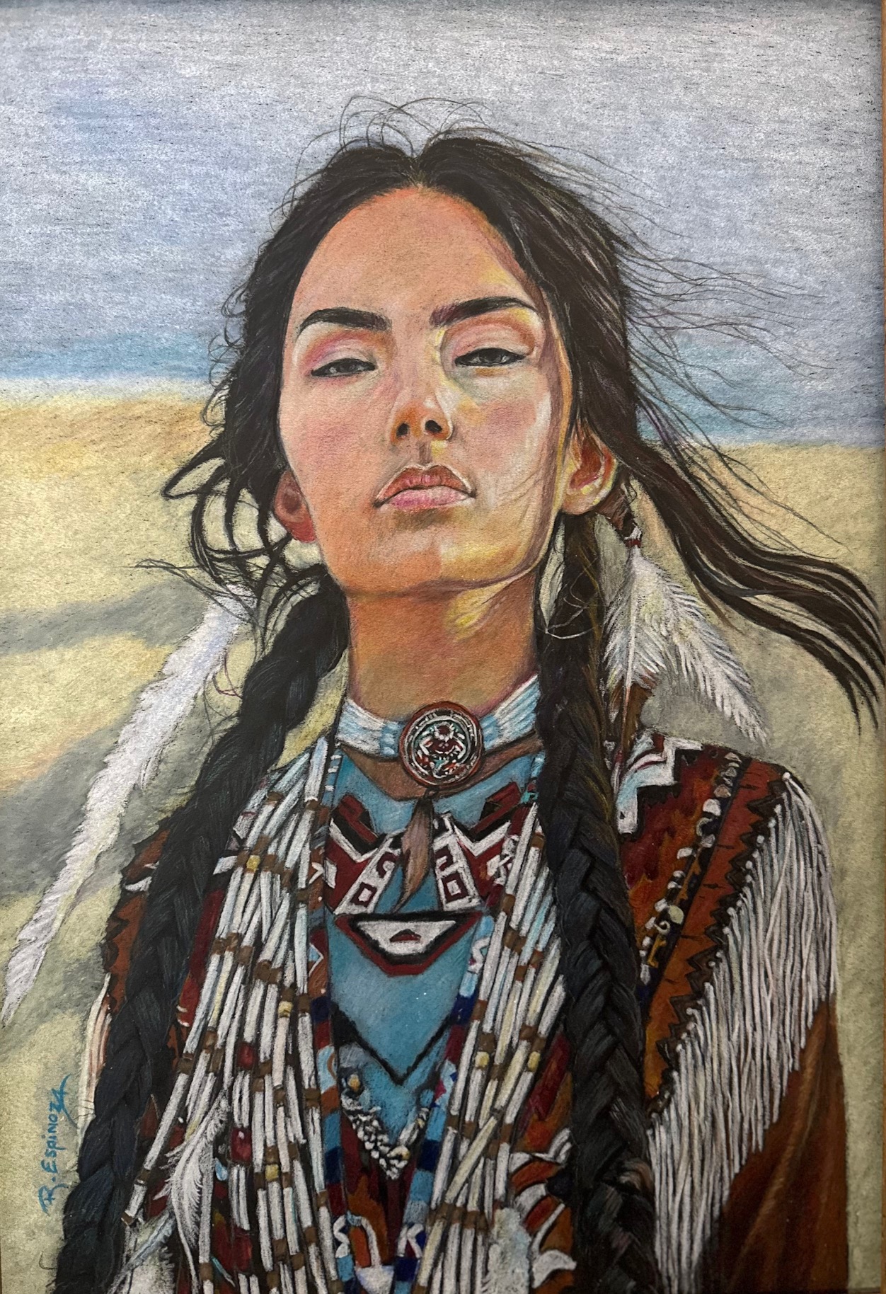 Known for his distinctive layering technique, Espinoza’s work radiates depth, vibrancy and emotion. His pieces not only express a profound respect for Native American culture but also reflect a broader appreciation for the beauty found in everyday life and the people he meets along the way.